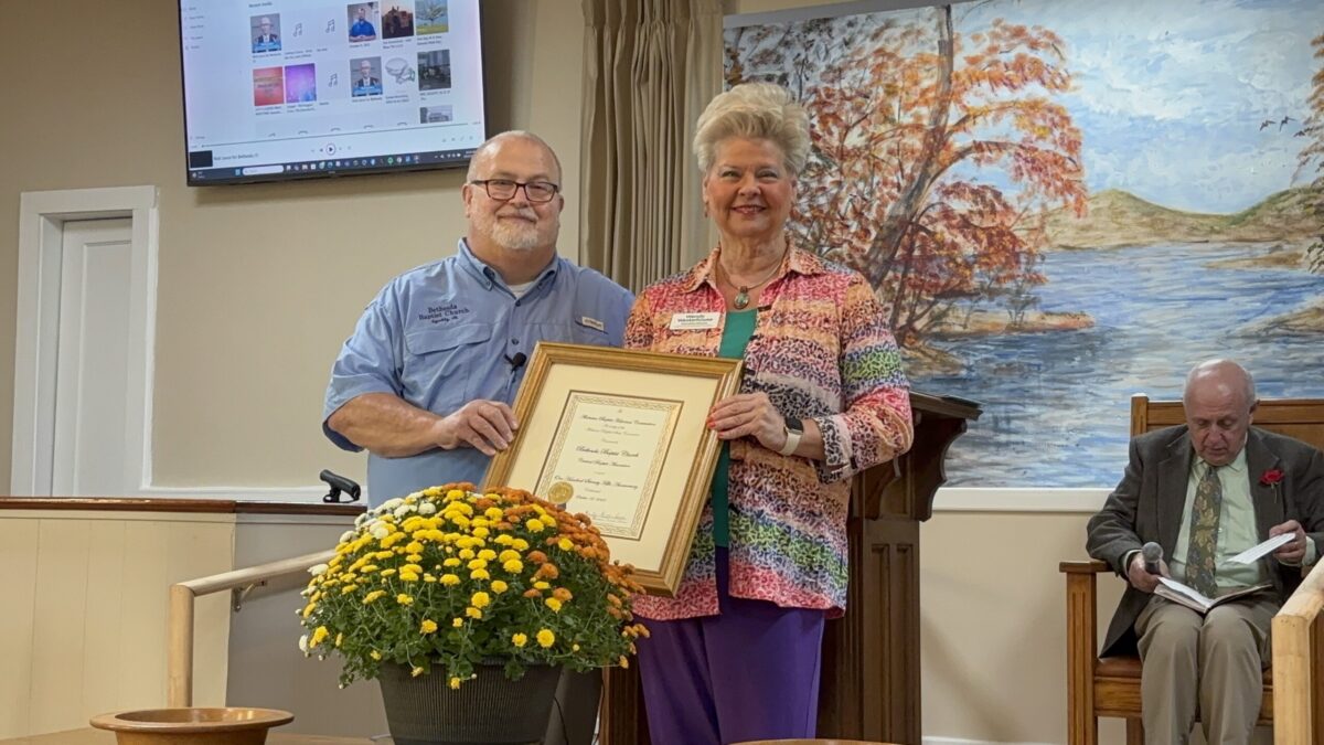Wendy Westerhouse (right), executive director of the Alabama Baptist Historical Commission, presents a commemorative plaque to Pastor Reuben Prater (left), who accepts the honor on behalf of the church.
