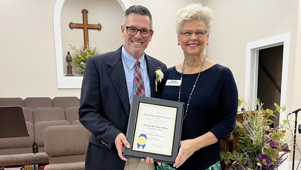 Commemorative plaques were presented to Chris Watkins (left), pastor, by Wendy Westerhouse (right) of the Alabama Baptist Historical Commission and Keith Wrenn, the association’s missions strategist.