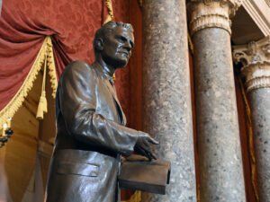 A newly unveiled bronzed sculpture of the Rev. Billy Graham at the U.S. Capitol in Washington, where it will stand on behalf of Graham’s native North Carolina, Thursday, May 16, 2024. (RNS photo/Jack Jenkins)