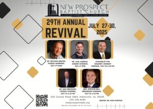 New Prospect Baptist Church, Haleyville, will hold its 29th annual revival July 27–30. Sunday services begin at 10 a.m. and 5 p.m. and Monday–Wednesday at 6:30 p.m.