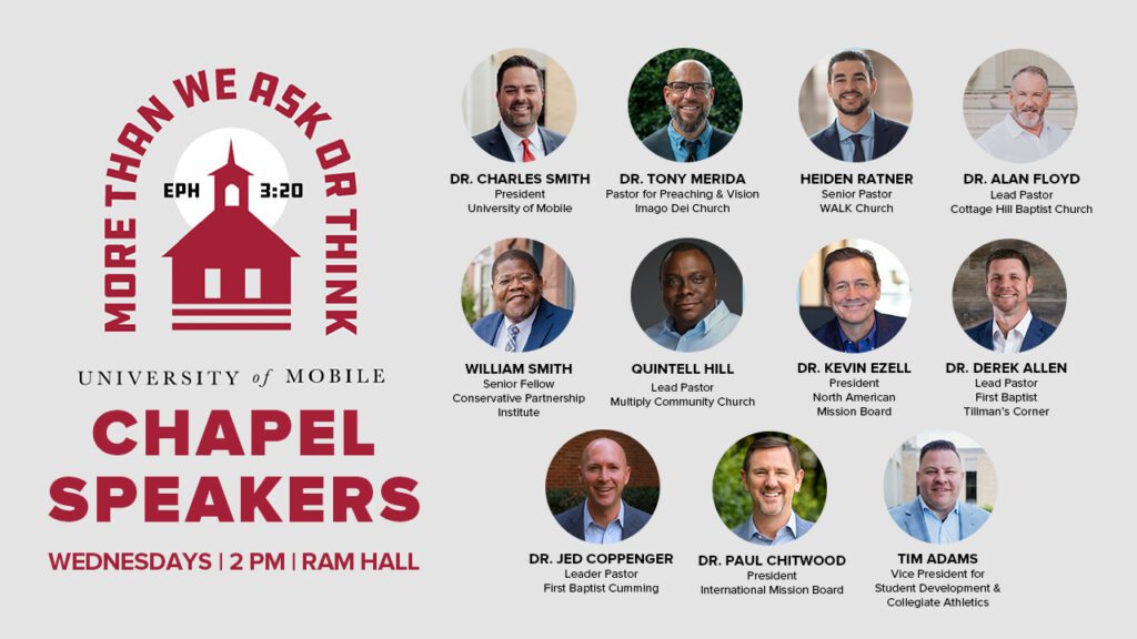 The University of Mobile will welcome an exciting lineup of Chapel speakers for the Spring 2026 semester, continuing a tradition that inspires, challenges and unites the UM community each week.